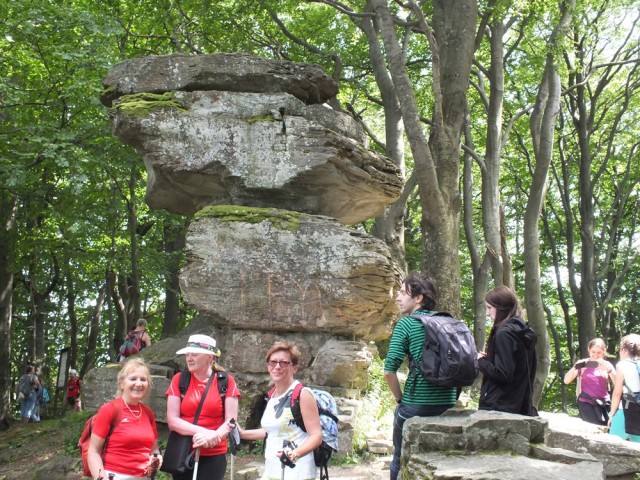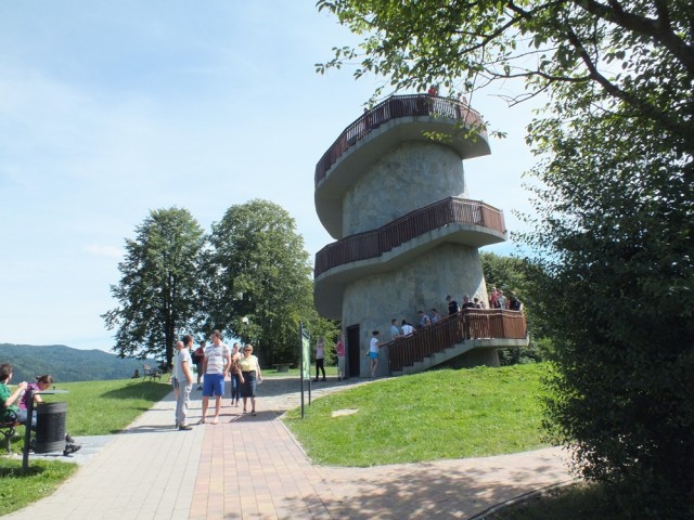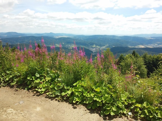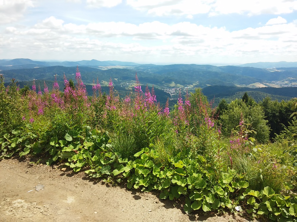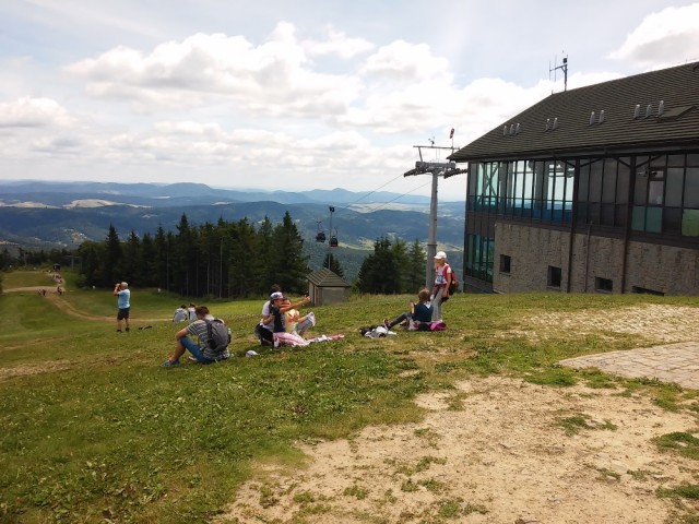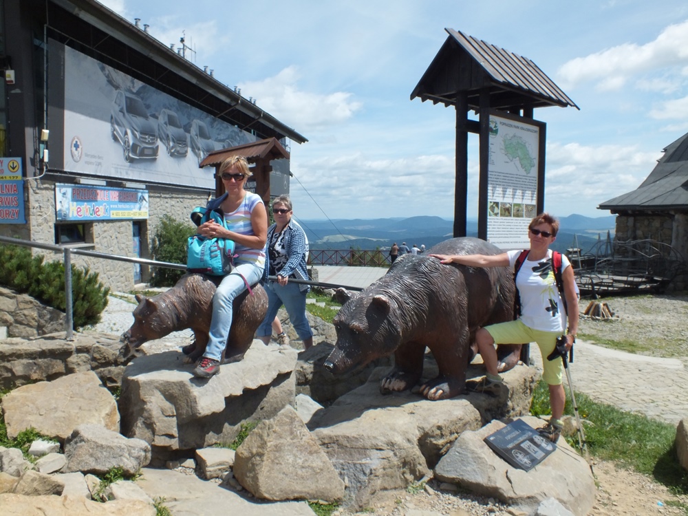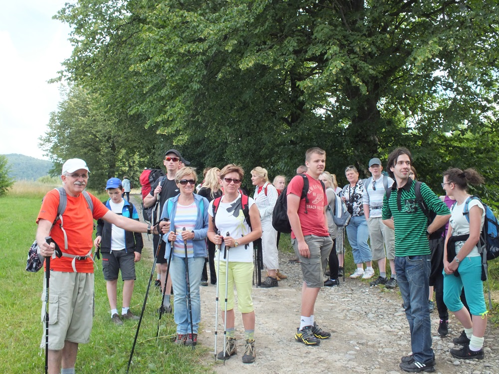 Długą aleją lipową doszliśmy do skraju lasu i po dwóch godzinach marszu dotarliśmy na szczyt Jaworzyny Krynickiej ( 1114 m n.p.m.). W panoramie Beskidu Niskiego wyróżniały się szczyty: Lackowej, Bušov’a i Magury Stebnickiej.