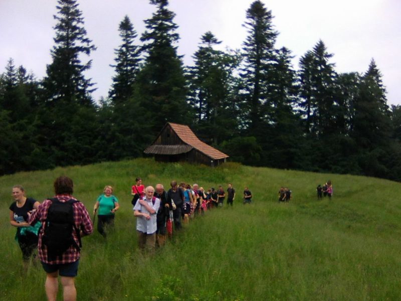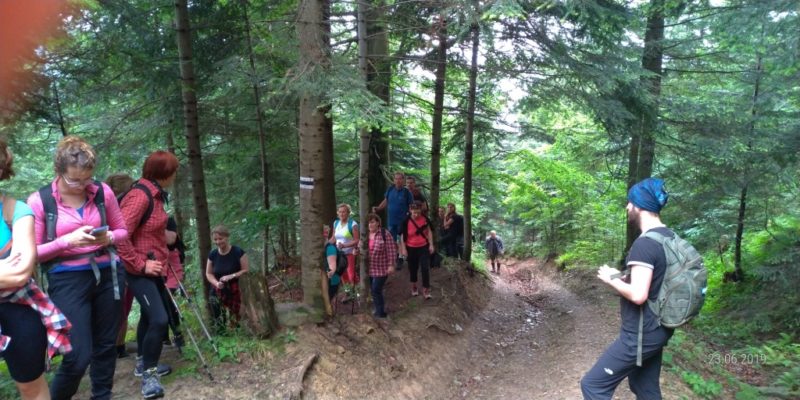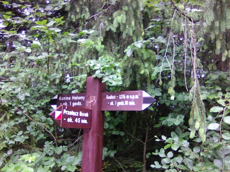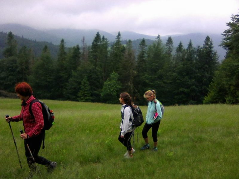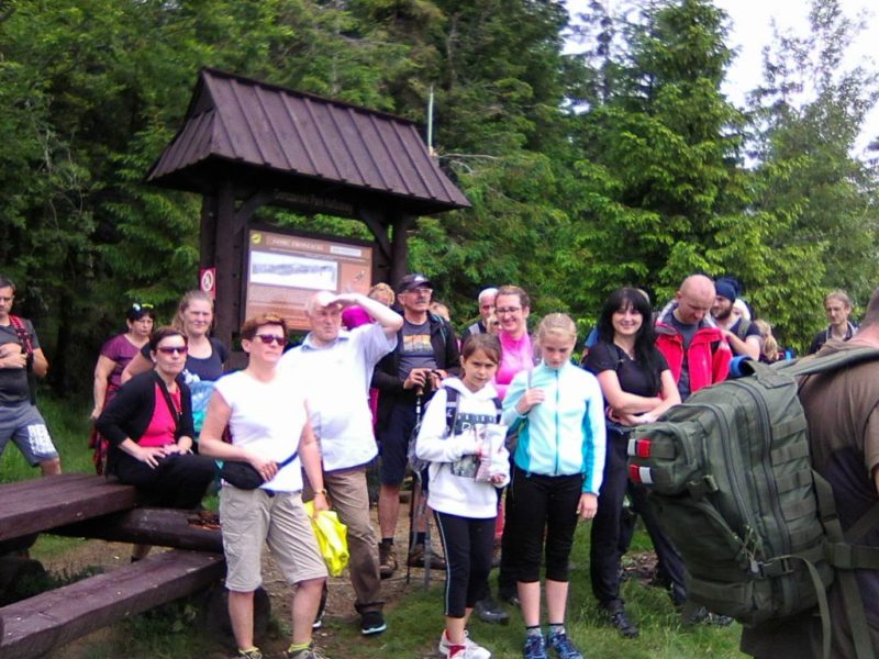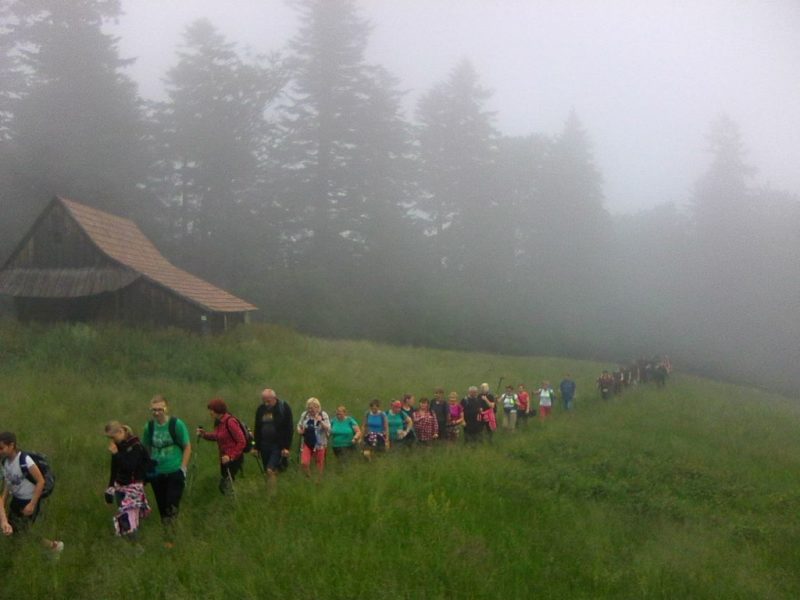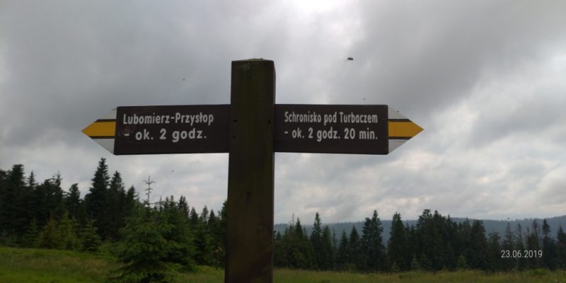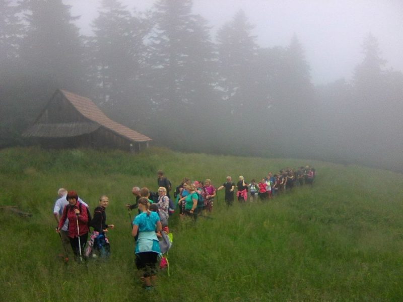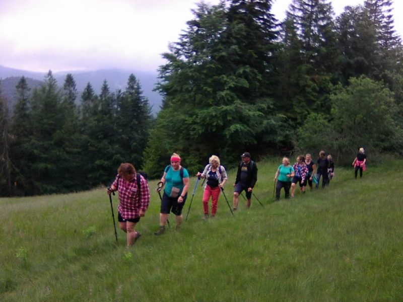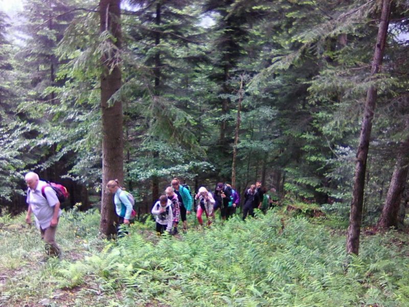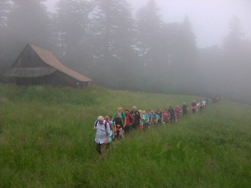Odtąd wędrowaliśmy pieszo czarnym szlakiem, początkowo dosyć ostro pod górę, od uroczej polany o nazwie Cyrla Hanulowa trasa nieco złagodniała. Krótki odpoczynek w lesie i kolejna polana, tym razem ze wspaniałym widokiem – Kopa (już ponad 1000m). Dalszy spacer pozwolił nam na podziwianie polan o nazwie Figurki Niżnie i Figurki Wyżnie, aż osiągnęliśmy polanę Pustak, gdzie spotkaliśmy żółty szlak idący od Turbacza. Wspomniana polana również słynie z widoków, ale tym razem nie był on imponujący, zwłaszcza w stronę Turbacza. Przypomniała się pieśń zapisana przez Władysława Orkana w powieści „W Roztokach”: