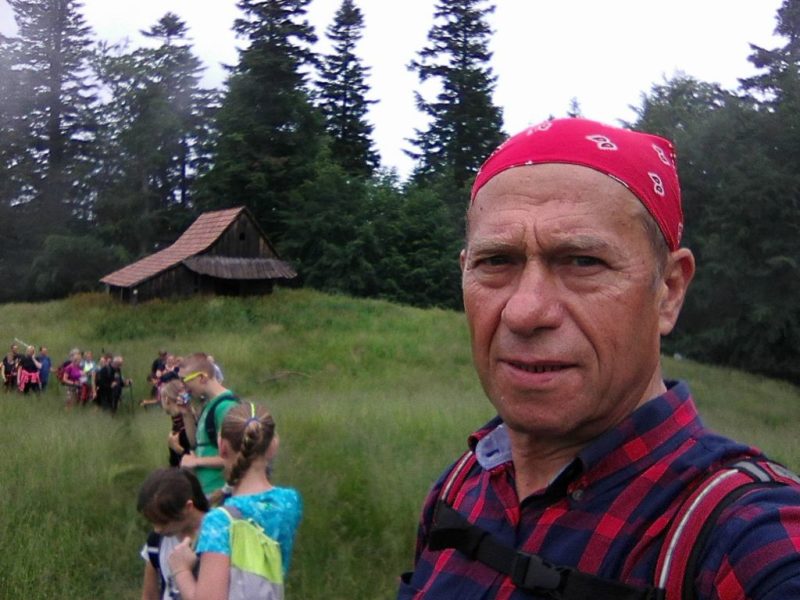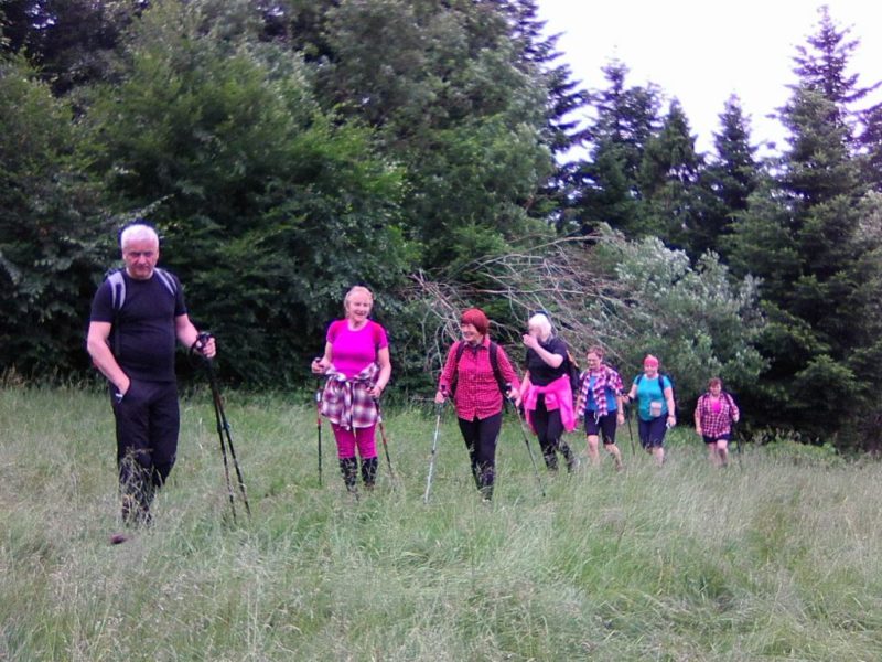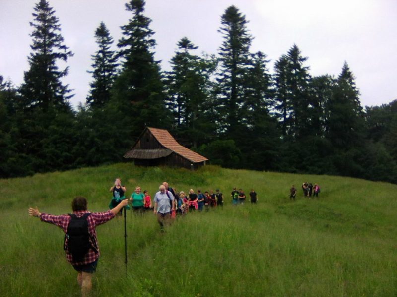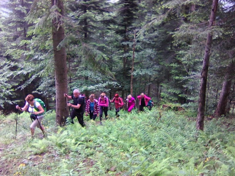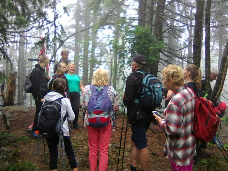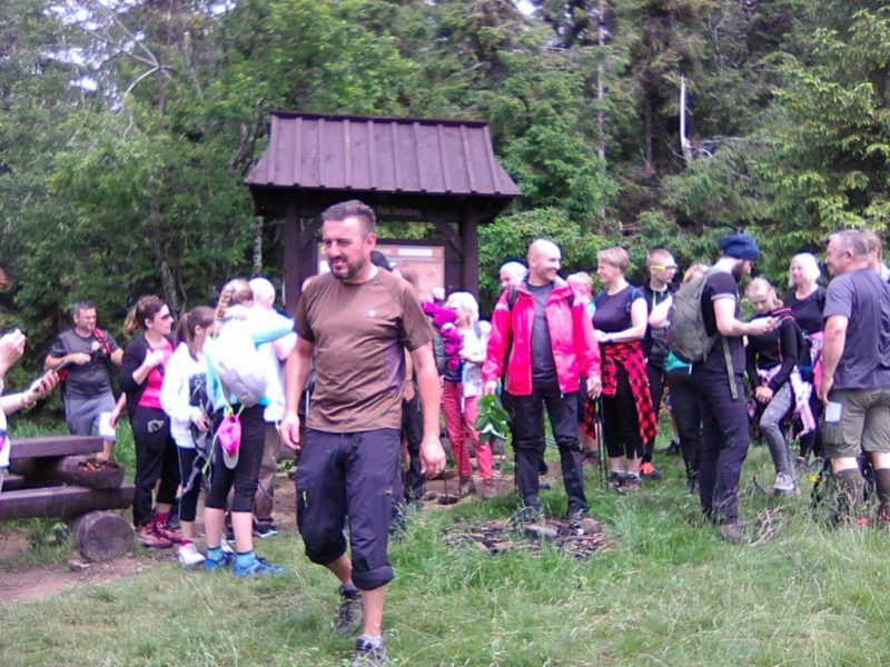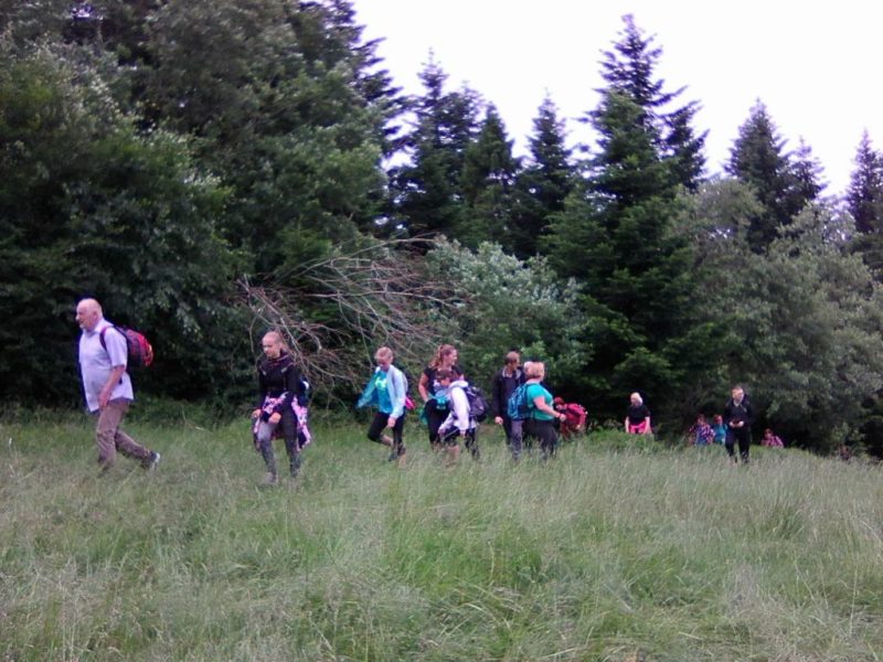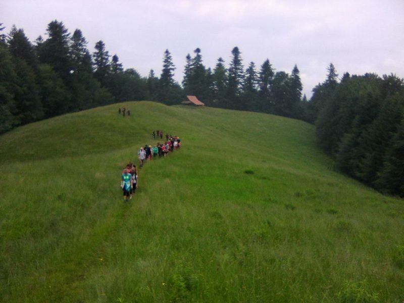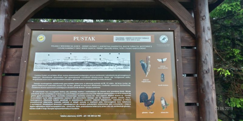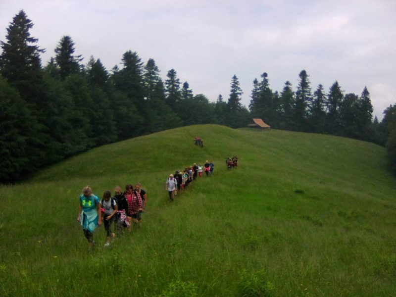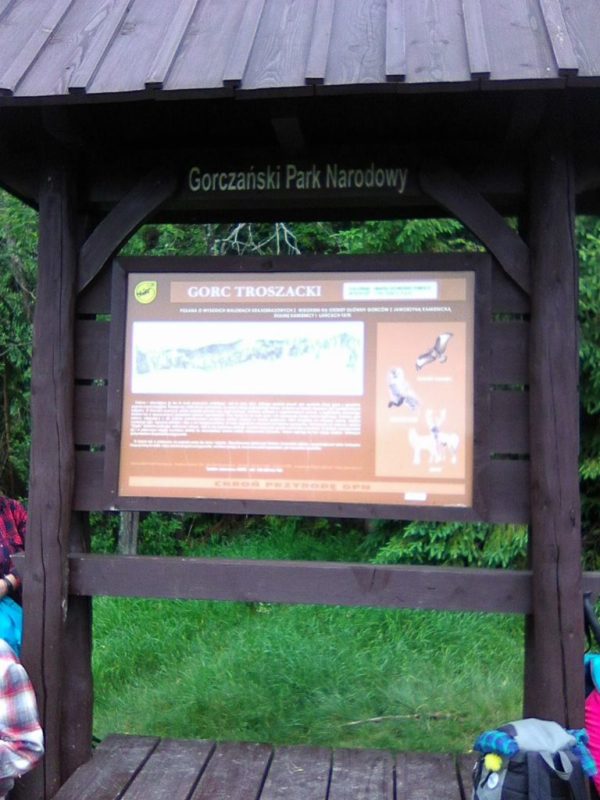 Odtąd wędrowaliśmy pieszo czarnym szlakiem, początkowo dosyć ostro pod górę, od uroczej polany o nazwie Cyrla Hanulowa trasa nieco złagodniała. Krótki odpoczynek w lesie i kolejna polana, tym razem ze wspaniałym widokiem – Kopa (już ponad 1000m). Dalszy spacer pozwolił nam na podziwianie polan o nazwie Figurki Niżnie i Figurki Wyżnie, aż osiągnęliśmy polanę Pustak, gdzie spotkaliśmy żółty szlak idący od Turbacza. Wspomniana polana również słynie z widoków, ale tym razem nie był on imponujący, zwłaszcza w stronę Turbacza. Przypomniała się pieśń zapisana przez Władysława Orkana w powieści „W Roztokach”:
