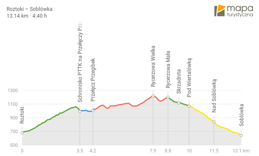 Trasa piesza: Roztoki – schronisko PTTK na przełęczy Przegibek – Rycerzewa Wielka – Soblówka (w przypadku złych warunków atmosferycznych trasa może ulec zmianie).